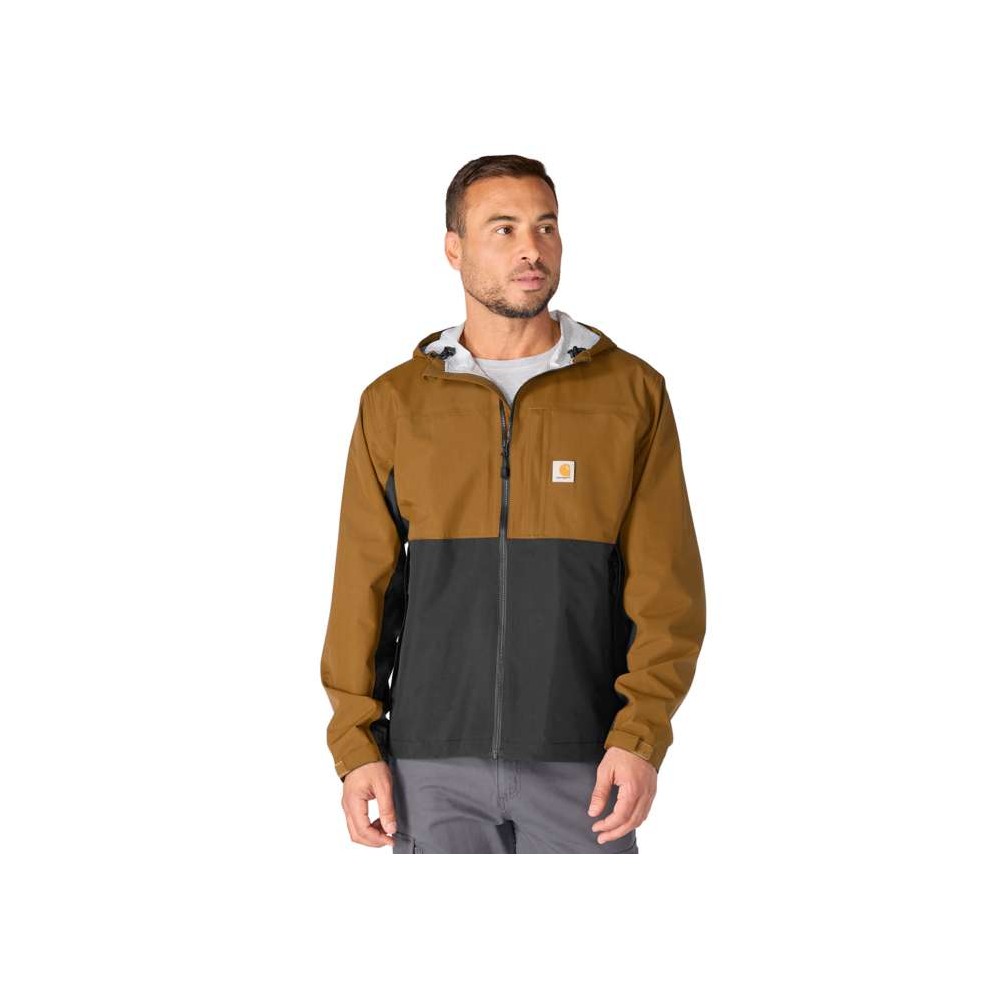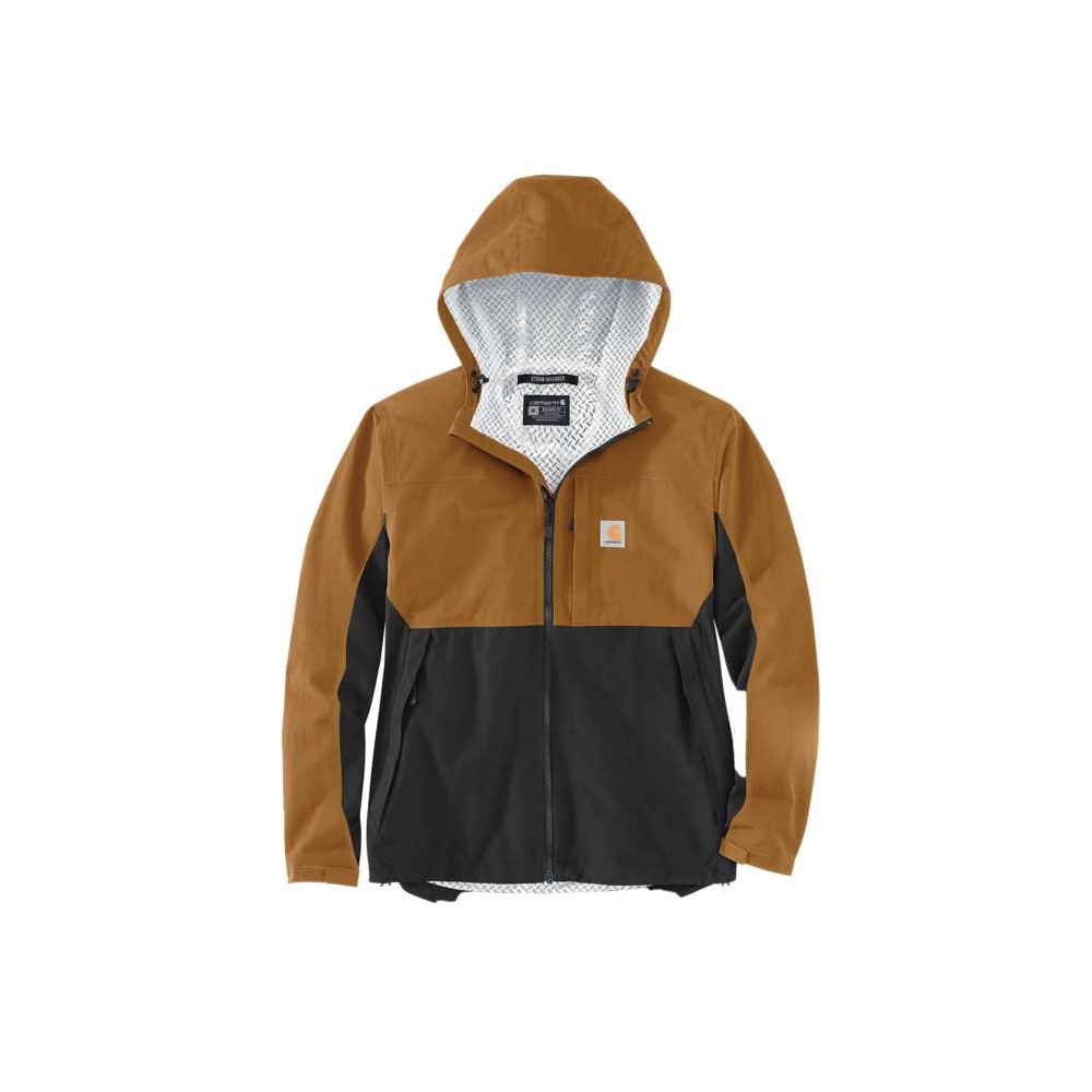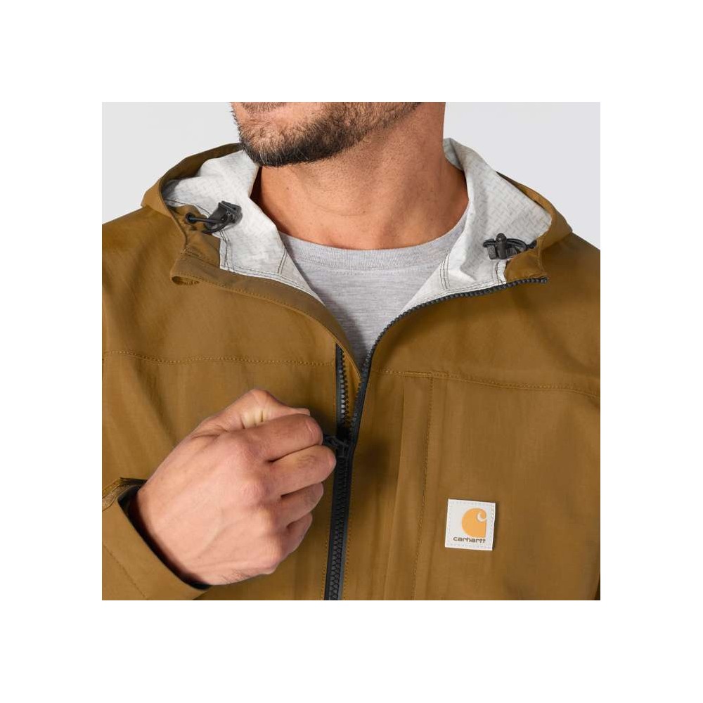 Corte Relaxed Fit · Wind Fighter™ - Resistente al viento · Storm Defender™ - Membrana laminada impermeable y transpirable · Capucha de tres piezas unida con bajo ajustable y cordón oculto · Cuello tipo "mock neck" (alto, sin vuelta) · Manga larga · Bolsillo en el pecho con cierre de cremallera · Dos bolsillos frontales inferiores con cierre de cremallera · Se puede guardar dentro del bolsillo inferior izquierdo con cremallera · Bolsillo interior con cierre de gancho y bucle (tipo velcro) · Cremallera frontal de largo completo con protector para la barbilla · Puños parcialmente elásticos con cierre de gancho y bucle para un ajuste adicional · Bajo trasero extendido para mayor cobertura con cordón ajustable · Costuras completamente selladas e impermeables · Etiqueta Carhartt cosida en el bolsillo · Tejido de punto plano (Woven) · 4,2 oz/yd² - 143 g/m² · Nylon con tratamiento repelente al agua (DWR) · 100% Nylon