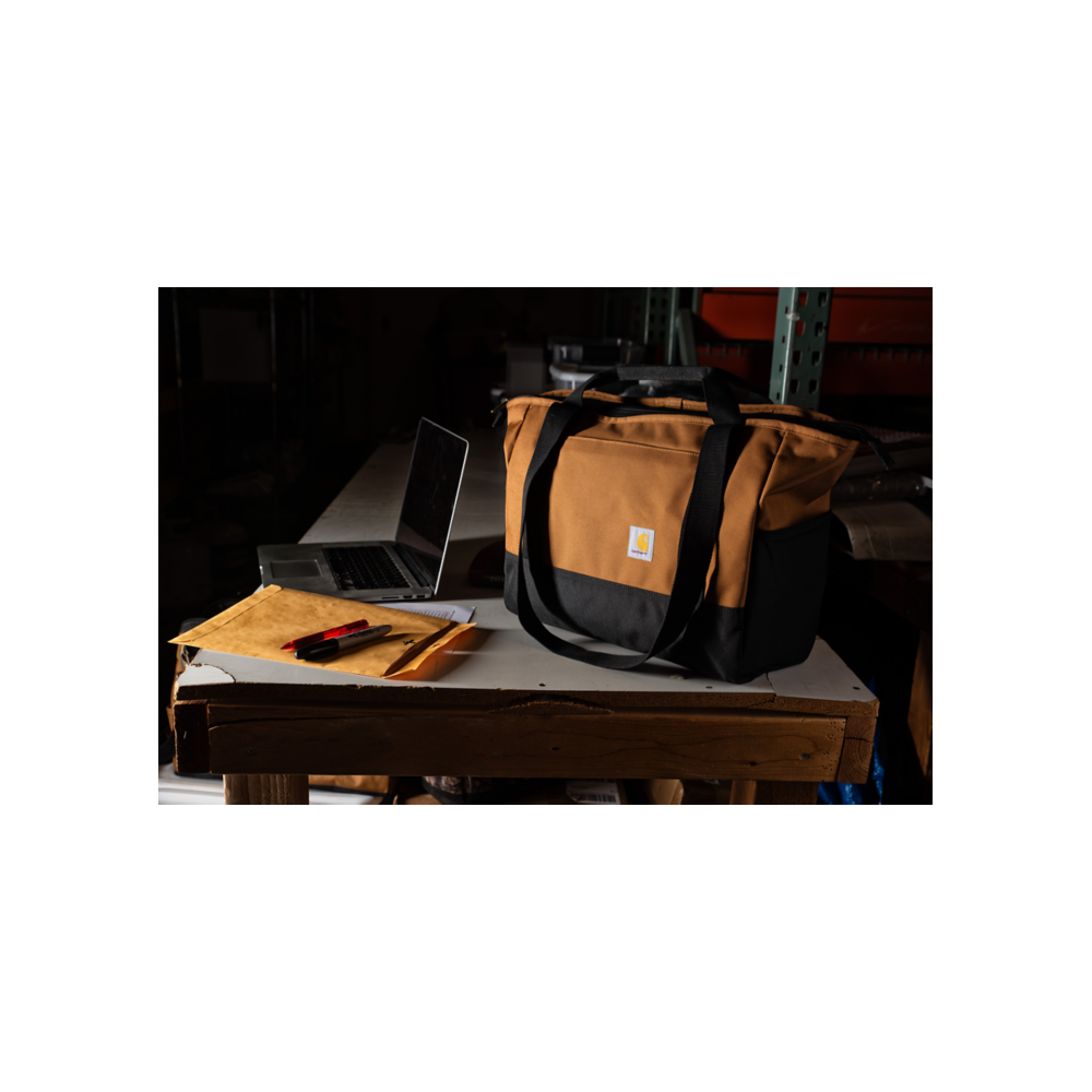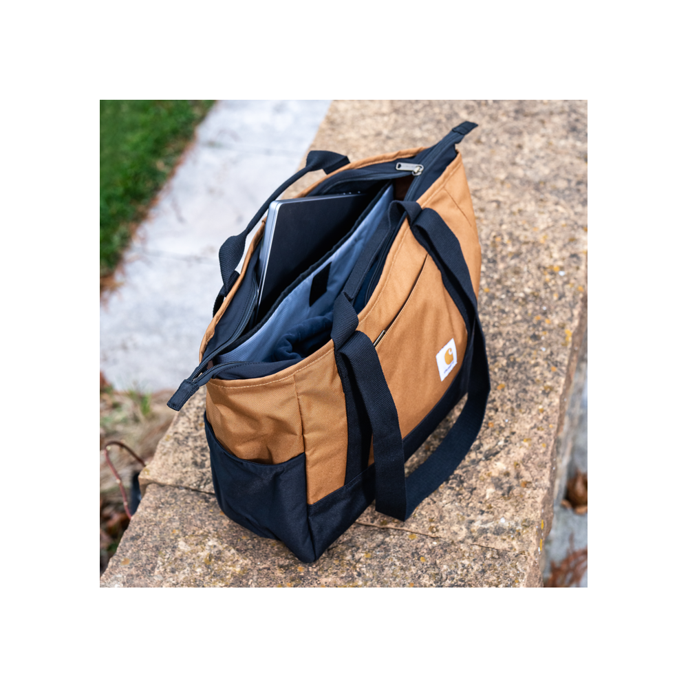 Rain Defender™ - Acabado repelente al agua duradero · Asas para llevar a mano y al hombro · Bolsillo frontal con cremallera · Compartimento principal con cierre de cremallera y funda para portátil de 17" · Dos bolsillos laterales elásticos · Bolsillo interior con cremallera forrado en tricot con compartimentos para bolígrafos · Bolsillo trasero tipo “deslizable” que se convierte en funda para trolley · Dos bolsillos interiores y organizador interno · Compartimento principal con cierre de cremallera · Etiqueta Carhartt en la parte frontal · Tejido tejido · Poliéster DWR de 600 deniers · 100% Poliéster